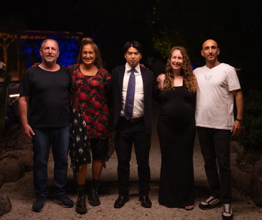 משפחת תומר: אביב, מורן, נילי ואייל עם נציג השגרירות היפנית מאצוסה טאקומה