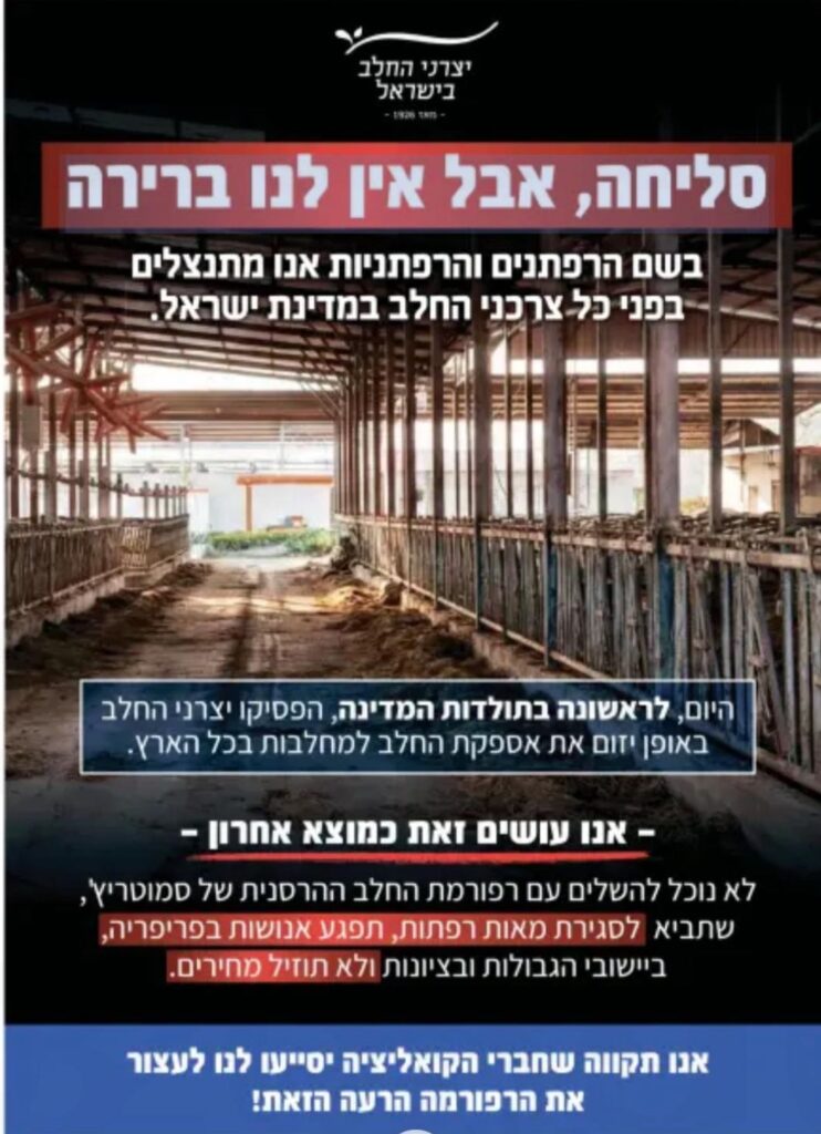 הרפתנים פרסמו הודעת התנצלות בפני הציבור על כך שהם נאלצים להפסיק את אספקת החלב "כמוצא אחרון", לדבריהם.