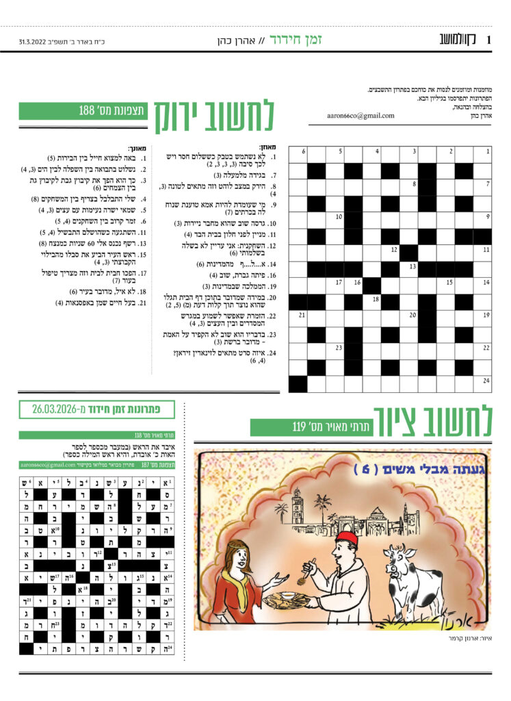 מוזמנות ומוזמנים לנסות את כוחכם בפתרון התשבצים. ניתן להדפיס את העמוד. שאלות, תהיות ופתרונות שלחו לאהרון כהן aaron66co@gmail.com