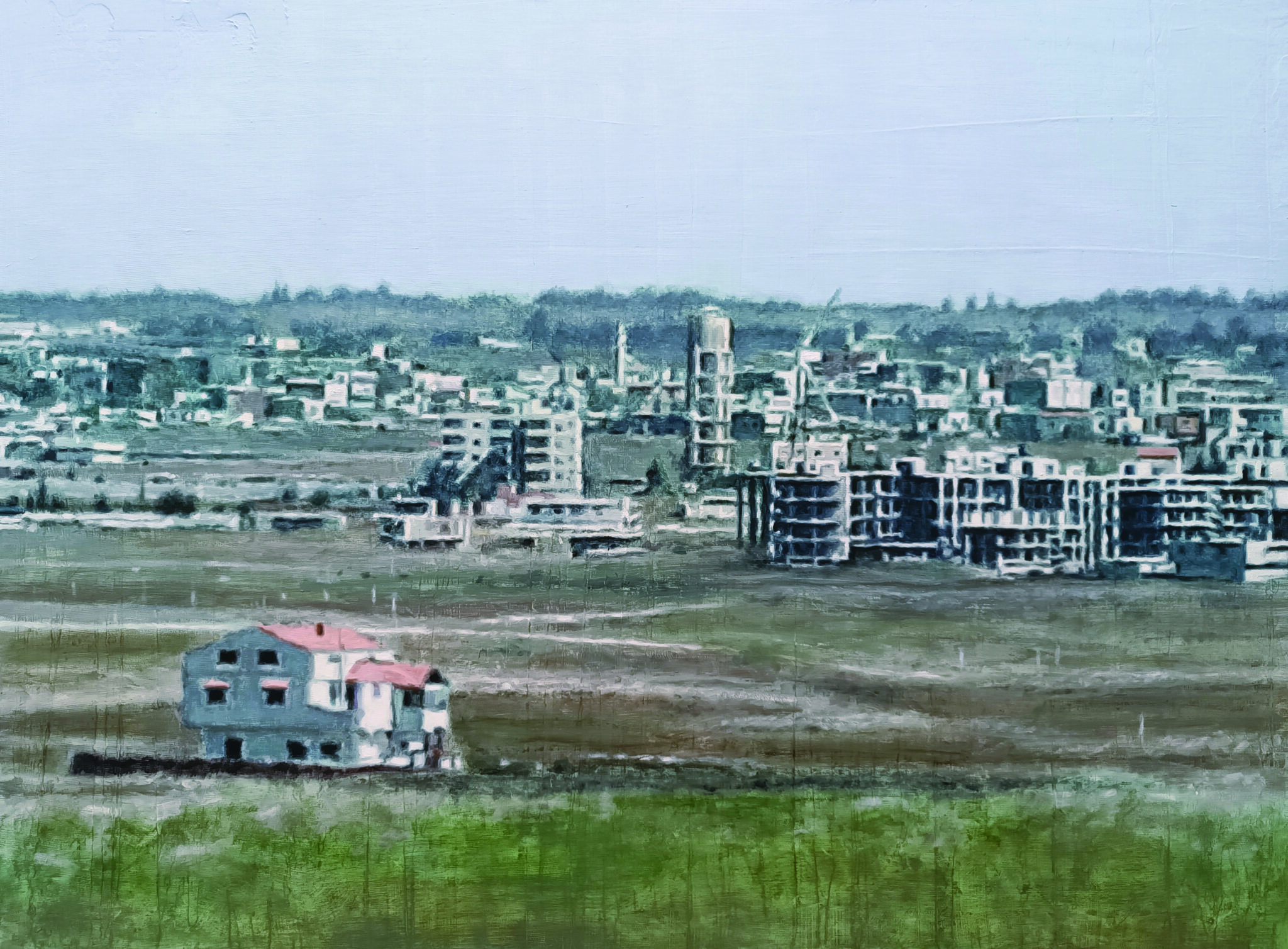"נכון. גם זה תולדה של ה-7 באוקטובר. לפני כן לא התעסקתי עם מה שמעבר לגבול. זה נראה לי לא רלוונטי, אפילו שהגבול מאד קרוב אלי. אבל אחרי מה שקרה, פתאום אתה מפנה את המבט וקולט שהגבול ממש פה, ליד. ואז אמרתי זה כל כך מפחיד אותי, אני אנסה קודם כל לראות את הדבר הזה. את הצד השני, את סוריה. התחלתי להתקרב לכל מיני נקודות בגבול, כמה שיכולתי, וצילמתי את מה שראיתי בצד השני. צילמתי כמה שאפשר לעומק, ואמרתי עכשיו אני חייבת לעבד את הדברים האלה דרך הציור, והתחלתי לצייר את מה שצילמתי. ואז הפחד מפנה קצת מקום לדברים אחרים, כמו סקרנות. מי הם האנשים האלה שחיים שם. הם שונאים אותי או לא שונאים אותי. במה הם עסוקים, ומה זה בכלל הגבול הזה בינינו".