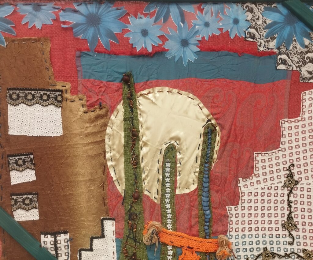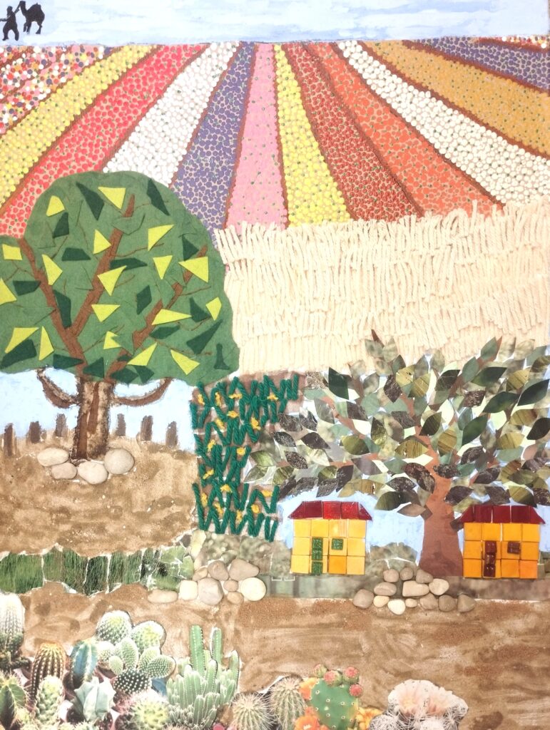 מאירה זיג מקיבוץ צאלים השתמשה ביצירתה "הבית בטשרניחובסקי 64 א" בבדים בטכניקת הקולאז'.