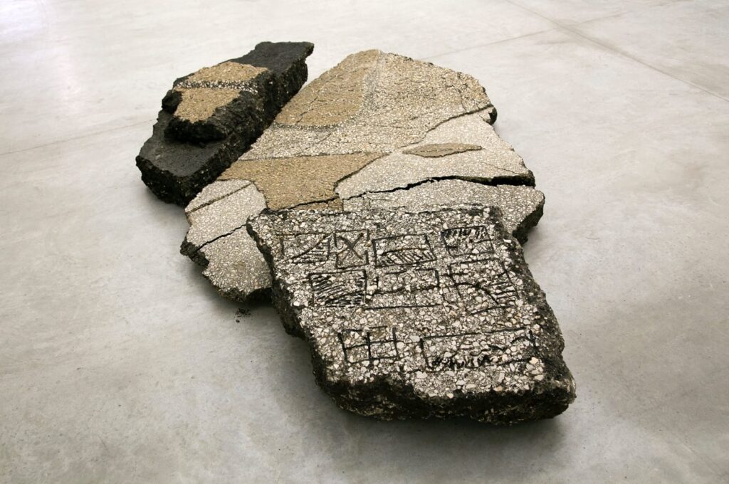 פסולת מסוג אחר קרי, שברי אספלט של כבישים, משמשת את נועה רז מלמד ליצירת פסל אופקי צמוד רצפה הקרוי "נופים שבורים (בעקבות קופפרמן) 2025". שברי האספלט והשכבות מתחתיו בעלי גווני השחור, הבז' והחום-אפור המנוקד בלבן, מורכבים יחדיו לתמונת תצרף של נוף מדברי צחיח, נטול חיים, כשהסדקים והמרווחים בין פיסות האספלט נדמים לערוצי נחלים חרבים, או כמטפורה לשבר ומשבר לאומי ו/או אישי והעדות היחידה לחיים קדומים מצויה בחריטות שחקקה האמנית באספלט הנדמות לכתב עברי קדום.