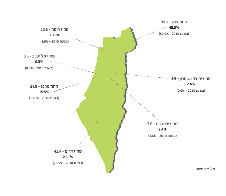 ואכן, מעל 70% מחברי וחברות התנועה הקיבוצית חיים בפריפריה של מדינת ישראל – כמעט מחצית מאוכלוסיית הקיבוצים (48.3%) מתגוררת במחוז צפון. כחמישית (21.1%) במחוז דרום. במחוזות חיפה, תל אביב ומרכז ביחד- מתגוררת כרבע מאוכלוסיית הקיבוצים.