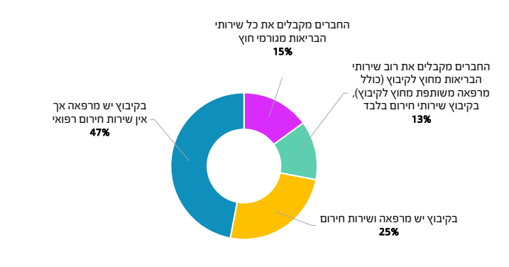 ב-13% מהקיבוצים מקבלים החברים את רוב שירותי הרפואה מחוץ לקיבוץ (בקיבוץ יש שירותי חירום בלבד) וב-15% מקבלים החברים את כל שירותי הרפואה מחוץ לקיבוץ.