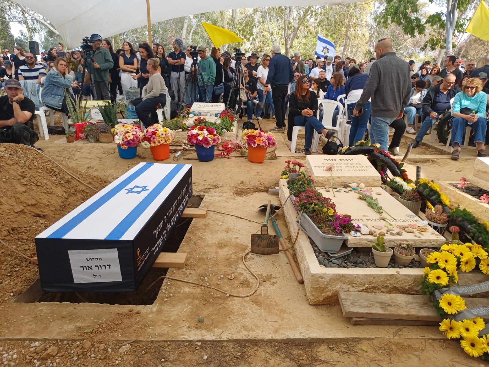 מאות אנשים ליוו את מסע הלוויה של דרור אור שנרצח בקיבוצו בארי עם אשתו יונת. גופתו של דרור נחטפה ב-7 באוקטובר והושבה ארצה לקבורה לפני שבוע. נעם ועלמה, ילדיהם של דרור ויונת נחטפו לעזה והושבו במסגרת העסקה הראשונה