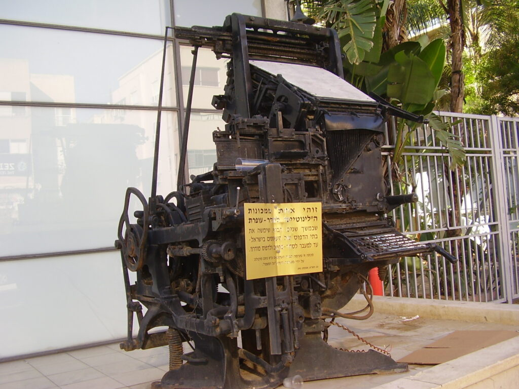 מכונת דפוס ישנה להדפסת עיתונים, בבית סוקולוב, שנתרמה על ידי "על המשמר"
