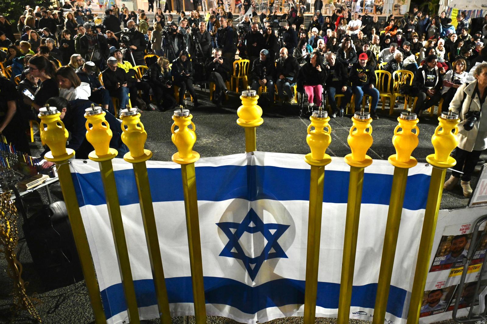 המונים השתתפו בהדלקת נר שמיני של חנוכה בכיכר החטופים להשבתו של החלל החטוף רן גואילי