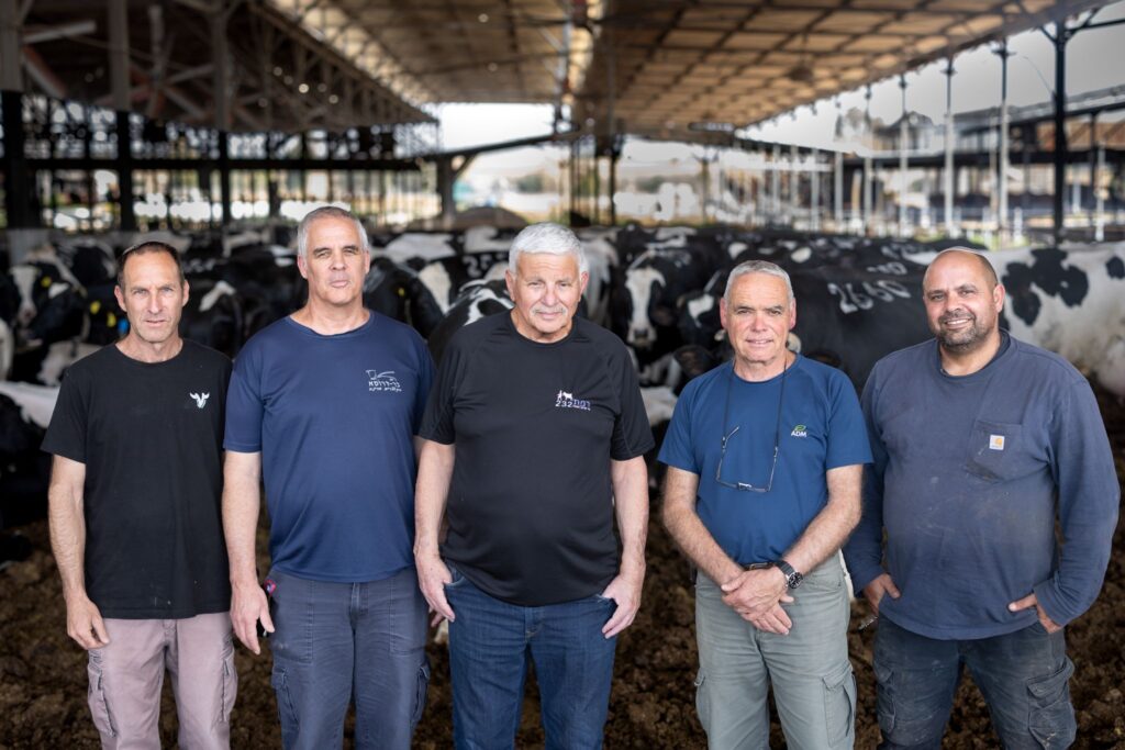 רפתני הנגב המערבי (מימין לשמאל): אבי מויאל (רפת חלוצה), אבי פריימן (רפת עלומים), שמיל בלברמן (רפת 232), אודי שהם (רפת סעד), בני קינן (רפת עלומים). השלכות הרפורמה המוצעת עלולות להביא לסגירת רפתות בפריפריה | צילום: שחר יורמן