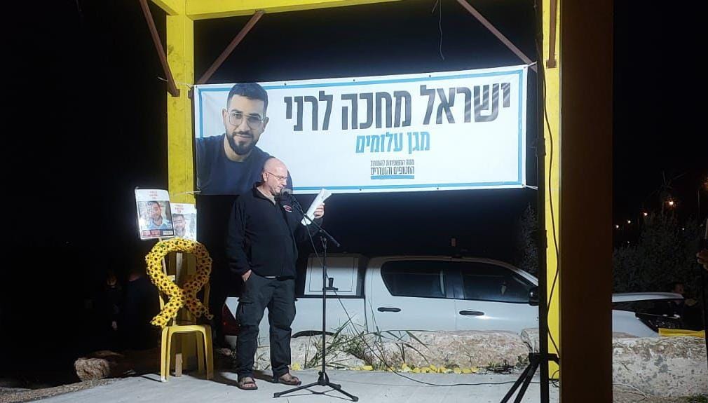 במוצאי שבת נערכה עצרת בצומת הקשתות כמדי שבוע, ביום ה-843 מאז 7 באוקטובר. בין הדוברים אסתר מרכוס, נציגת קיבוץ עלומים ממנו נחטף רן, זמיר חיימי, דודו של טל חיימי חבר קיבוץ ניר יצחק, דבורה עידן, אמו של צחי עידן שנרצח בשבי וסבתה של מעיין שנרצחה בשבת ההיא ודודתו של רן, יעל ג'אן.