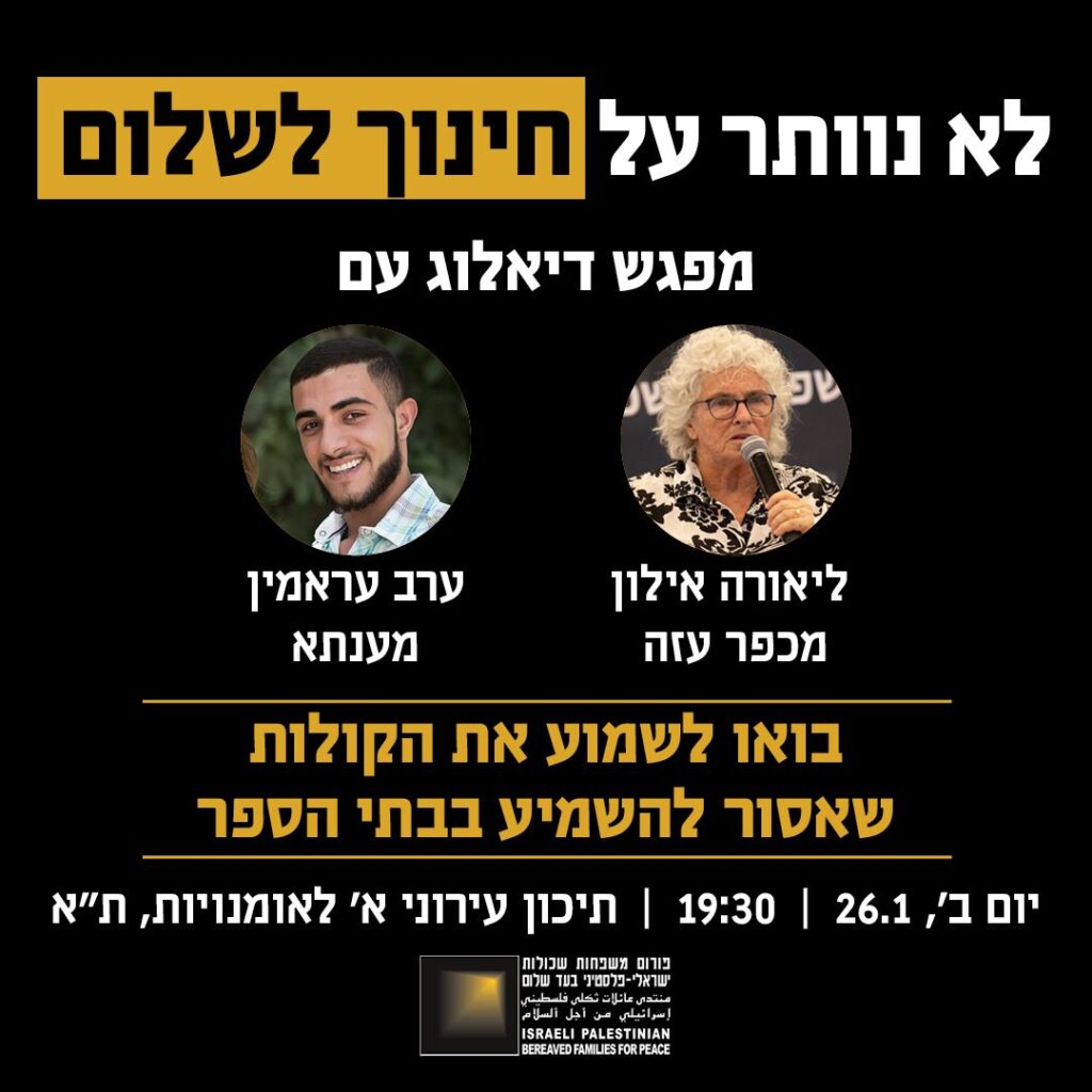 החלטת משרד החינוך להוציא מבתי הספר את פעילות פורום המשפחות השכולות הישראלי-פלסטיני נתפסת בעיני ליאורה כסמל למגמה רחבה יותר. “האיסור הזה מייצר מציאות הפוכה מזו שאני מאמינה בה”, היא אומרת. “הוא מייצר השתקה והפחדה, ומבוסס על שקרים שהופכים לאמת. אם ‘כל ערבי הוא מחבל’, איך נאמין בשלום?”