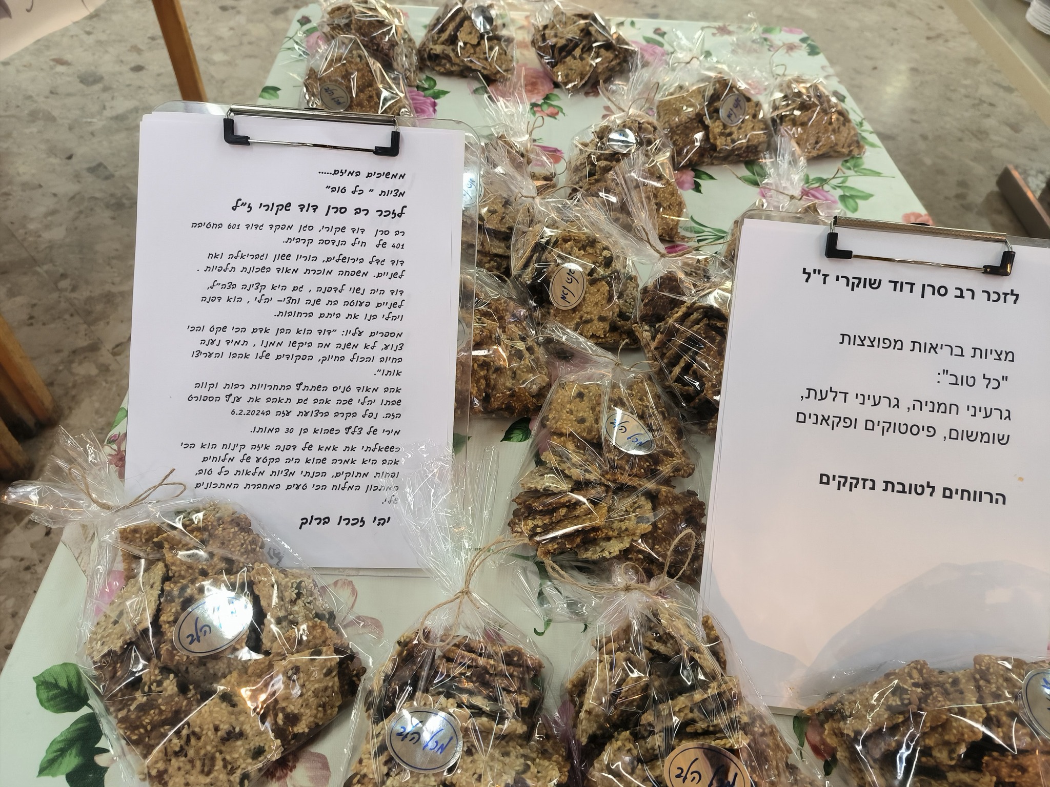 מבחינת פופולריות, היא אומרת שכולן נקנות מהר. "אחד מהחברים התקשר והציע את רב סרן דוד שקורי מרחובות (סגן מפקד גדוד 601 של הנדסה קרבית, שנפל בקרב בצפון הרצועה ב-6.2.2024). אימא של אשתו אמרה שהוא העדיף מלוחים ואמרתי לה שאני אכין את הכי טוב שיש לי במתכונים – קרקרים מלוחים עם המון פיסטוקים, שומשום, פקאנים וגרעינים דלעת, דברים טובים. היא אמרה אחר כך שהטעם הולך איתה מאז".