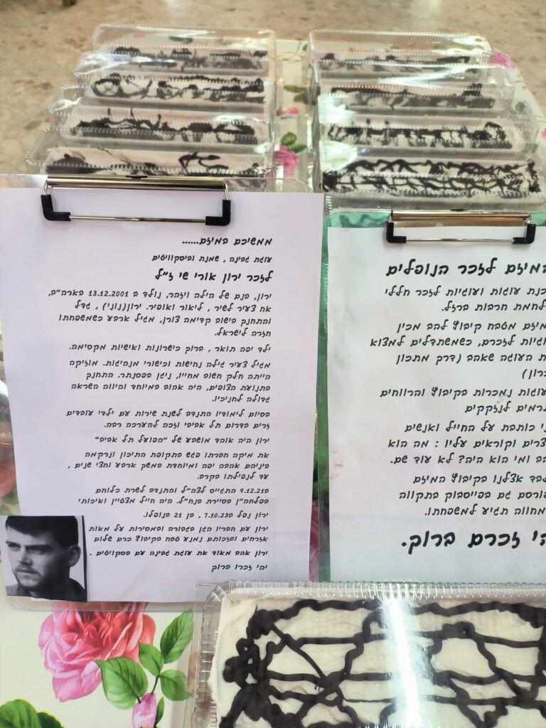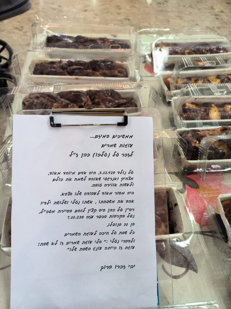 בתגובה לבקשה לצרף לכתבה צילומים, היא שולחת בזריזות לוואטסאפ 20 תמונות של עוגות ניצבות מסודרות בקפידה. "לבקשתך. לצערי יש עוד המון", מקלידה ומוסיפה אימוג'י בוכה. סופלה שוקולד, קרואסוני שקדים קטנים, עוגת שוקולד ופרלינים, עוגת פירות יבשים, שוקולד ופקאן, תפוזים ושוקולד צ'יפס בחושה, מייפל ואגוזים, שמנת ביסקוויטים וכך הלאה. "כשנגמרו לי המתכונים באתר התחלתי לאפות מתכונים אחרים. לאט לאט הגיעו פניות של משפחות ומחברים של חללים, הם שמעו עלי דרך הפרסום בפייסבוק, זה עבר מפה לאוזן. אחרי בערך 20 עוגות שונות שאפיתי כתבו עלינו במקומון של באר שבע, היו לזה הדים. אני ממשיכה בזה, זה כבר חרוט לי בנשמה וזה יותר מתחושה של חובה להזכיר את החייל, אנשים עוברים וקוראים כמה מילים עליו והוא לא נשאר בגדר שם בלבד", היא מספרת.