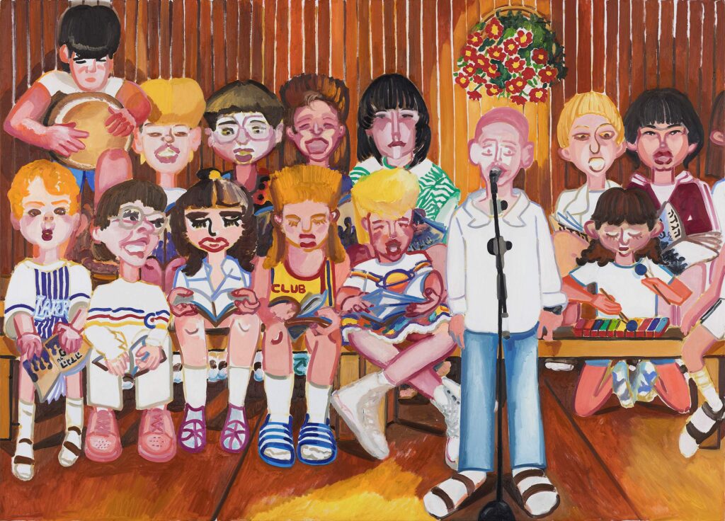 "רוב הדמויות הן אמיתיות, כולל הזקנים על הקלנועיות. לצערי תוך כדי המלחמה נפלו שני בני קיבוץ וזה שבר מאוד גדול וזה גם נכנס לציורים. החייל הראשון שנפל הוא עמית שחר וציירתי אותו כסולן בציור של מקהלת הקיבוץ הבין-דורית של פסח. זאת מקהלה דמיונית על זמנית וגם אני שם, למרות שאני גדולה ממנו בהרבה. גם שאר הילדים הם אמיתיים, מכל הדורות, מכיתות מעלי ומתחתי".