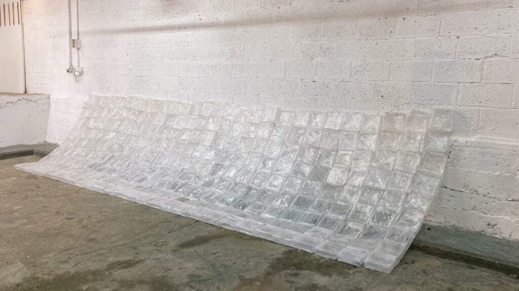 בעבודה הקרויה "מסה שעונה" נראית יריעה גדולת ממדים שחלקה העליון צמוד לחציו התחתון של קיר האטליה – קיר העשוי מבלוקים חשופים מבטון – הגולשת בזווית חדה מטה ומכסה נתח מהרצפה. היריעה מורכבת משורות מקבילות של קוביות של נפחי אוויר הנדמות ממרחק ללבני זכוכית, שנגרעה מהן הדופן התחתונה. הקוביות עשויות מפוליאתילן שקוף, המרכך את הקצוות החדים של הפרוטוטיפ הקובייתי. "שמיכת הפוך" במרקמה הקובייתי, או היריעה המאזכרת עטיפת "פקפקים" קובייתיים של דרור היבש מקרינה קלילות, ריחוף, רכות ושקיפות.