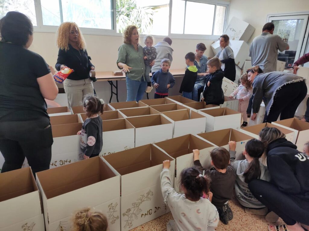אורזים יחד ארגזי מזון. באדיבות הקיבוץ