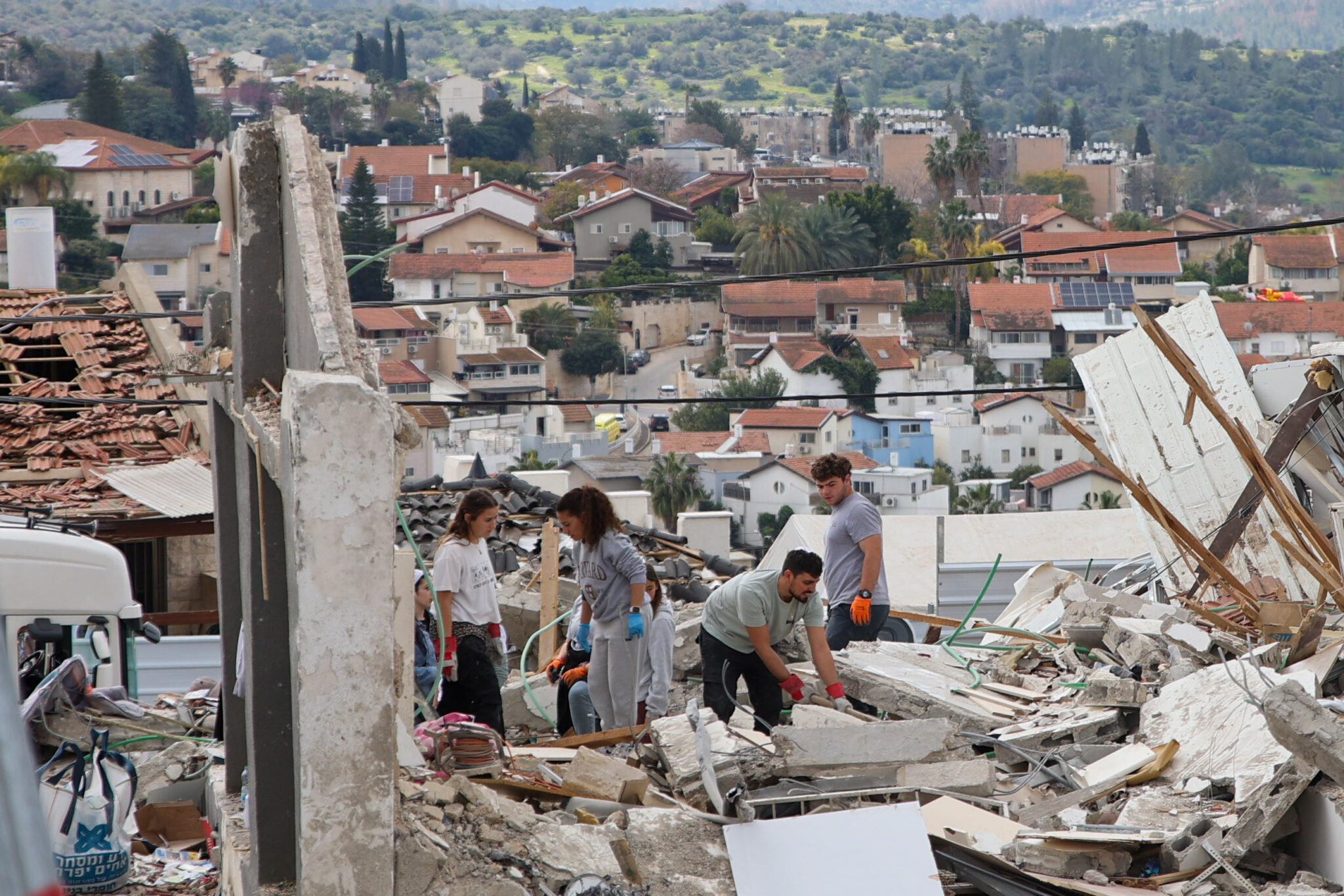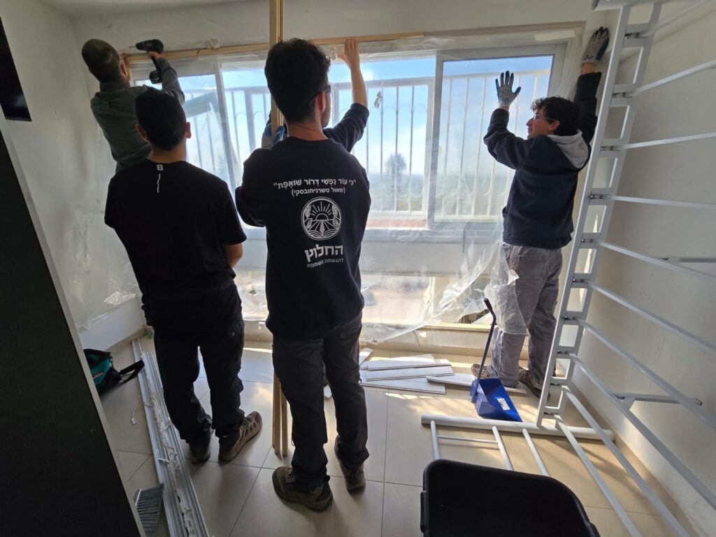 חניכי מכינת "דרור-מפלסים" בהתנדבות בפינוי הריסות וזכוכיות ואיטום חלונות בזירת הנפילה בבית שמש, בריכוז קיבוץ תמוז. באדיבות הקיבוץ